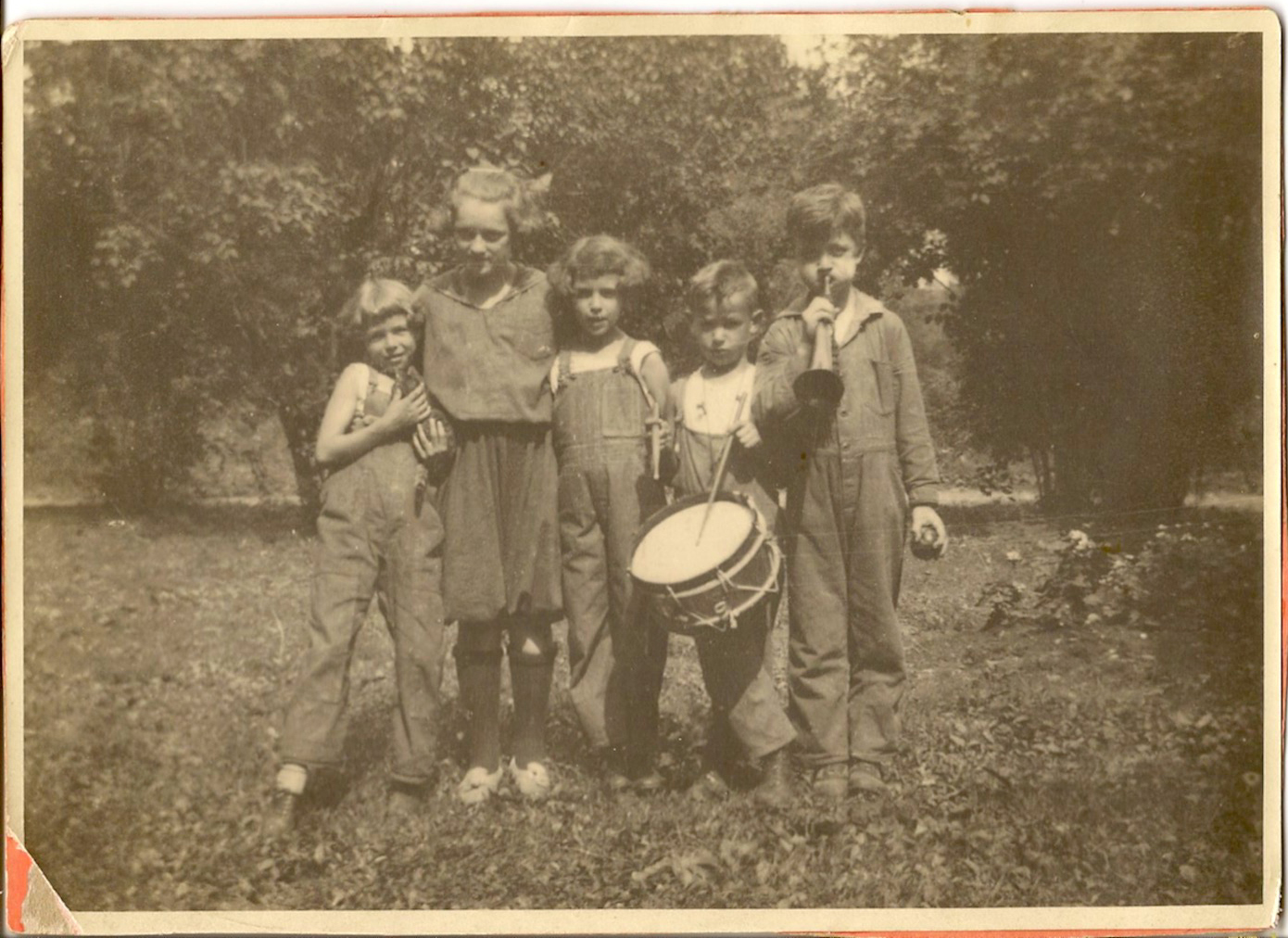 Six-year old Eddie Sauter with drum, drum sticks at the ready.